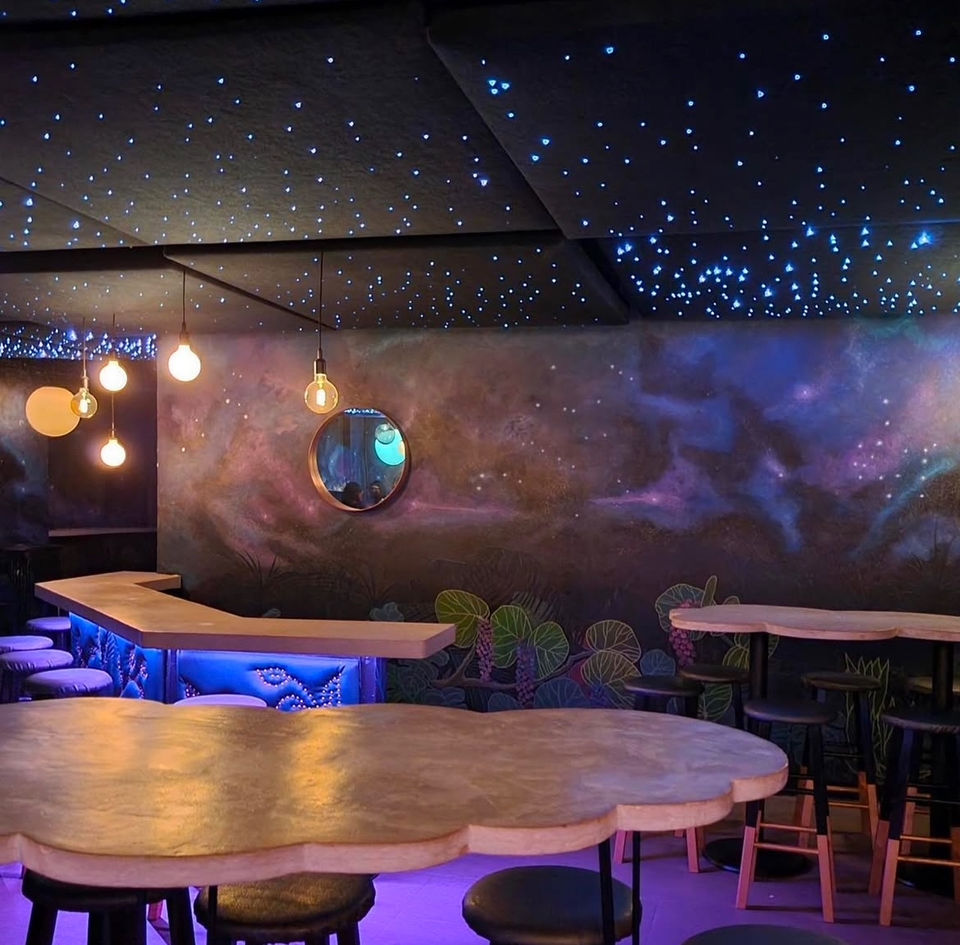 To enhance this celestial effect, the ceiling was covered with acoustic felt panels perforated with thousands of fiber-optic lights, simulating a twinkling night sky. The bar was crowned with a cluster of globe pendant lamps, adding warmth and elegance to the ambiance. Though the budget was modest, every detail was