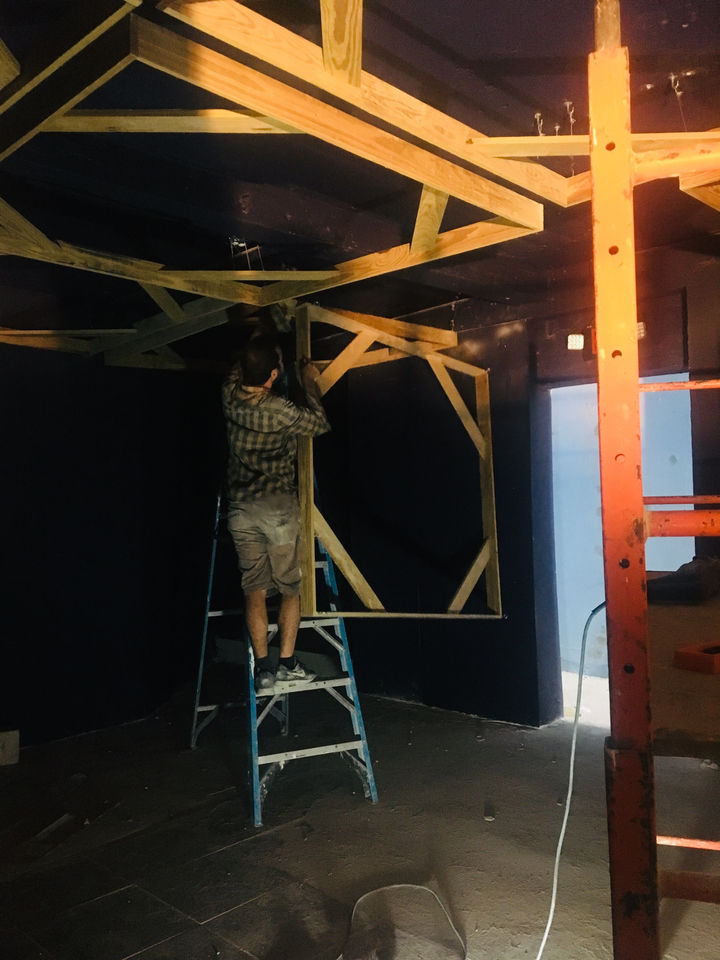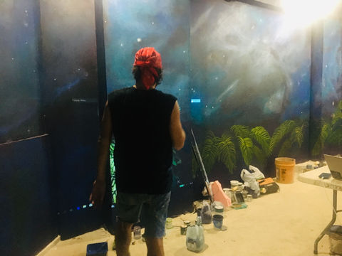 The space was in rough shape, and the ceiling wasn’t much to look at. But instead of seeing obstacles, Space Design saw an opportunity—the flaws actually helped shape the concept. To hide the imperfections, we went with a deep, moody color palette that captured the feel of a starry night. The lower walls were painted with lush Puerto Rican plants to bring in that connection to nature, while the upper walls faded into a sky full of stars, creating a magical, immersive vibe.